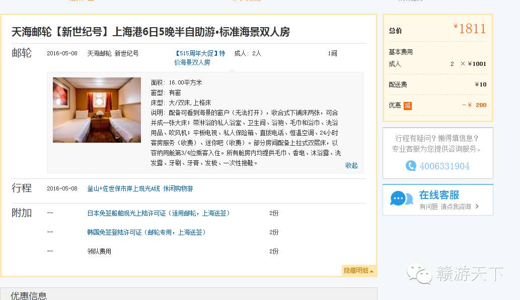 秒杀价仅包含船票。港务费(699元)、领队费(250元)、岸上游需另行支付!