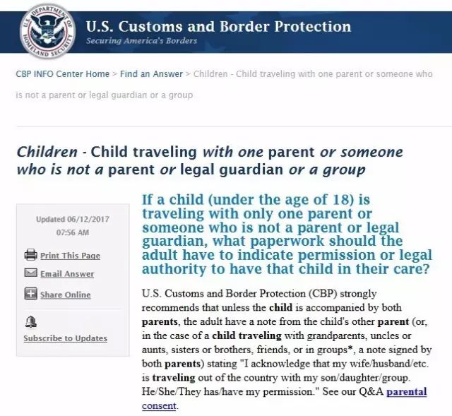 近日,美国国土安全部海关和边境保护局(以下简称CBP)对无父母陪同的未成年人出入美国国境做出更新提醒,明确规定: