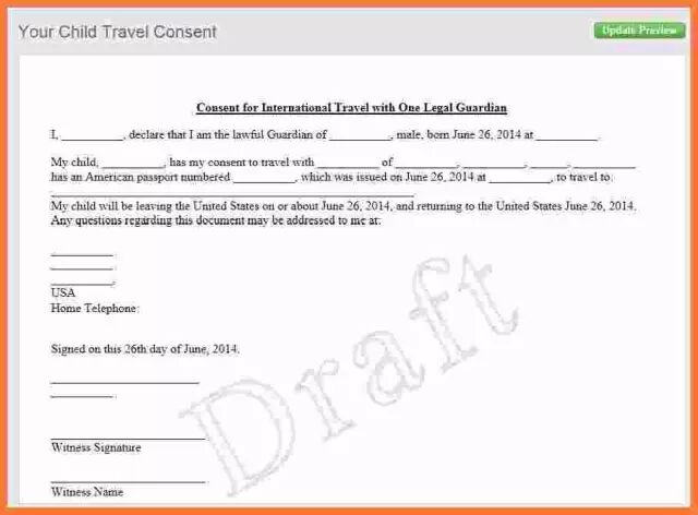 内容需包括自己的姓名,孩子的姓名,旅行人姓名,旅行地点,您的许可声明,您的联系方式。
