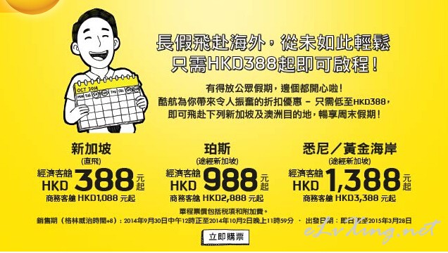 本帖最后由 E旅行新闻官 于 2014-9-30 15:08 编辑 预定链接:http://www.flyscoot.com/index.php/zhtw/promo-fares-hk.html 预定时间:即日-10月2日 出行时间:即日-2015年3月28日 参与航线: 香港=新加坡$823(65 ...