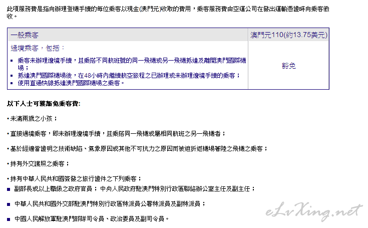 如图所示,按照规定48小时内转机离境之旅客可以豁免110MOP 。 理论上亚航澳门飞清迈的机票售价中应该已包含此服务费,但我发邮件问了澳门机场可否退费没有回复。 有没有知道的人指点一下? ...