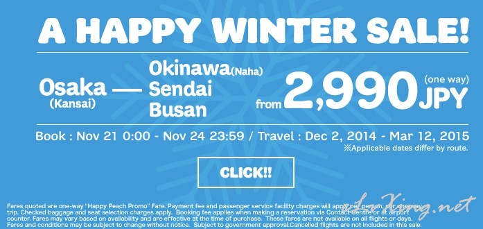 本帖最后由 E旅行机票达人 于 2014-11-25 10:06 编辑 链接:http://www.flypeach.com/campaign/happywinter_sale_20141121.aspx 订票日期:11月20日23点-24日23点 旅行日期:12月2日-15年3月12日 航线信息: ...