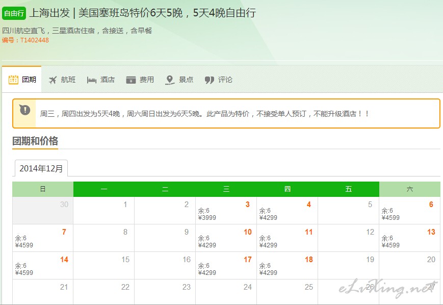 【预订链接】http://www.rqqtrip.com/tour/53ccdcff0cf210c0ceb0aa05 【出行日期】 12月3日 【价格包含】 1、上海-塞班往返经济舱机票含税; 2、塞班4晚/5晚酒店住宿(含早餐); 3、目的地机场至酒店往返接送用车 ...