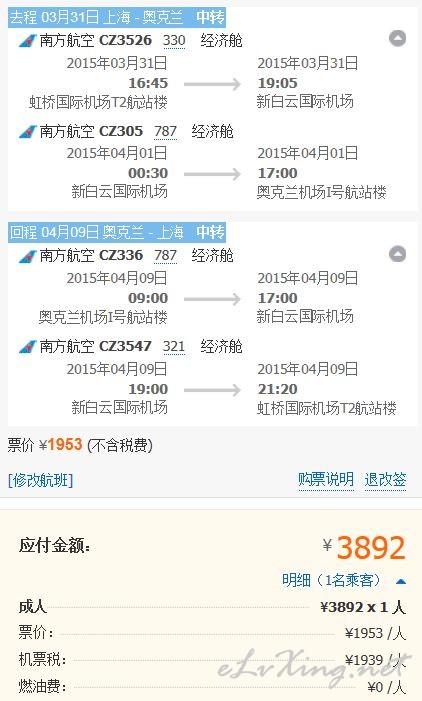 携程出票,查询了一下3月底出发到4月初返回都有这个价格,大家可以根据自己的时间自行查询 票还是充足的。现在去新西兰季节也还可以。 http://flights.ctrip.com/international/NewUI/Booking.aspx?OrderId=1195437 ...