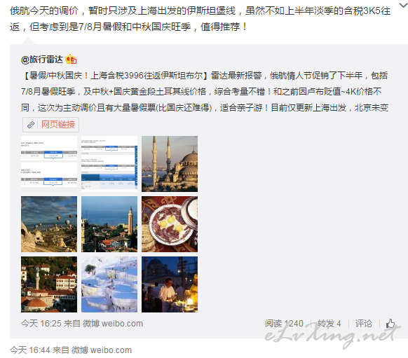 包括7/8月暑假旺季,及中秋+国庆黄金段土耳其线价格,综合考量不错!和之前因卢布贬值~4K价格不同,这次为主动调价且有大量暑假票(比国庆还难得),适合亲子游!目前仅更新上海出发,北京未变 转自微博雷达哥 ...