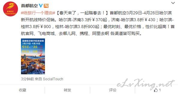 首都航空官方微博: #给旅行一个理由#【春天来了,一起踏春去!】首都航空3月29日-4月28日哈尔滨新开航线特价促销。哈尔滨-济南3.3折¥370起,济南-哈尔滨3.8折¥430;哈尔滨-桂林3.8折¥900,桂林-哈尔滨3.8折900起 ...