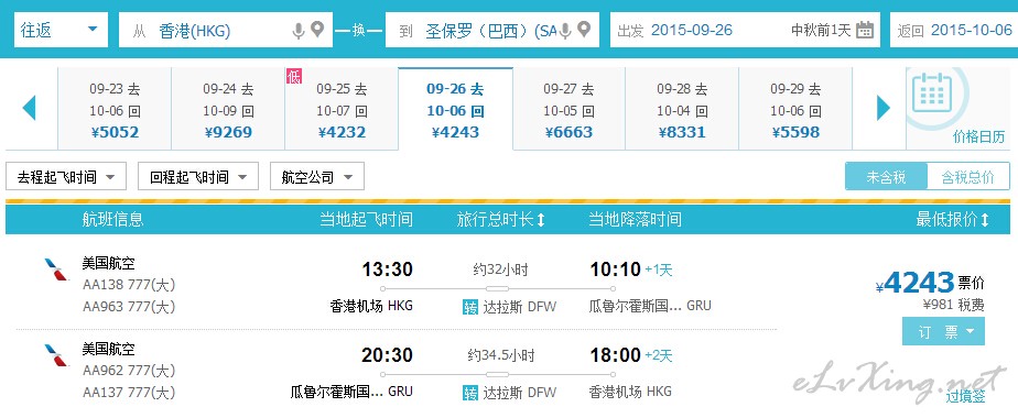本帖最后由 pp0pp 于 2015-5-23 17:02 编辑 香港=圣保罗¥5291含税 5.3K飞南美 很多日期都有票,中秋连国庆有,直到2016年1月都有,多查下。 各大订票网站应该都有,如QUNAR。 美国航空,达拉斯中转,记得也准备 ...