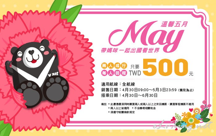 V Air威航歡慶母親節 全航线买去程回程仅500台币(约100元)