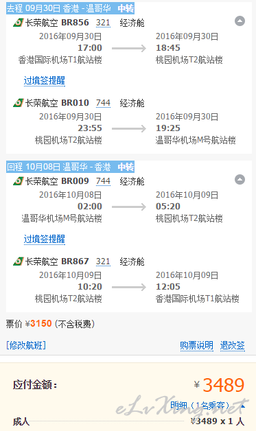 本帖最后由 Kuhn 于 2016-5-16 17:23 编辑 长荣航空 香港经台北转飞温哥华,往返含税3489元,9月30日-10月8日出行。长荣服务素质有保证,且已包2件23kg行李托运及餐食,转机停留时间也不长,有需要的可考虑入手。 ...