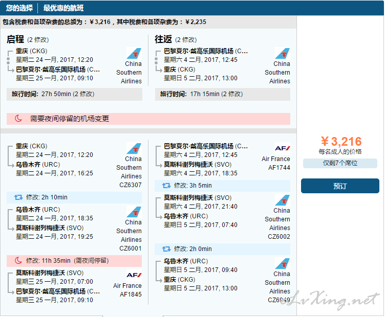 南航 跨春节1.24-2.4,重庆往返巴黎,含税3200+。 ...