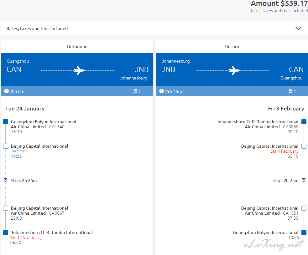 国航 广州经北京转机往返约翰内斯堡,正春节含税3595元,过年只需请三天即可,只有1件23kg行李托运。代理Bravofly查询出票,官网同期含税为3800+,多近300块。对于只有长假才能出行且刚需的童鞋可考虑入手了! 预定 ...