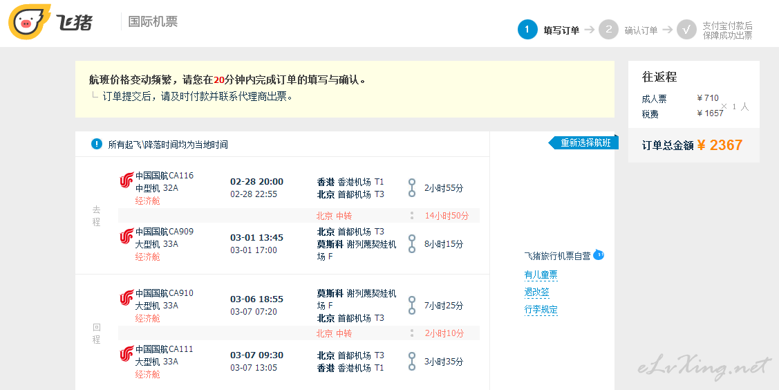 国航,香港经北京往返莫斯科含税2300元