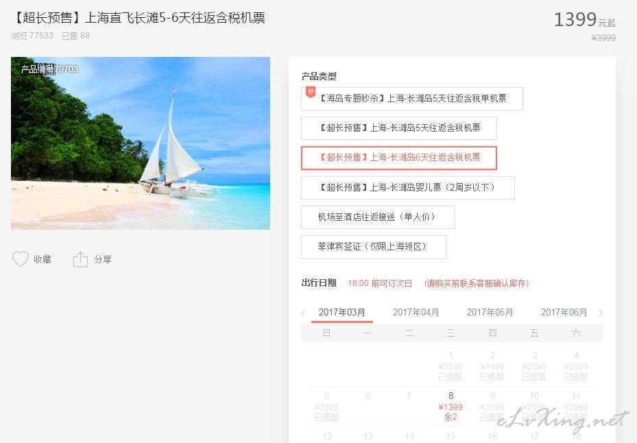 3月8日 上海直飞长滩岛6天往返含税机票 1399元 ...