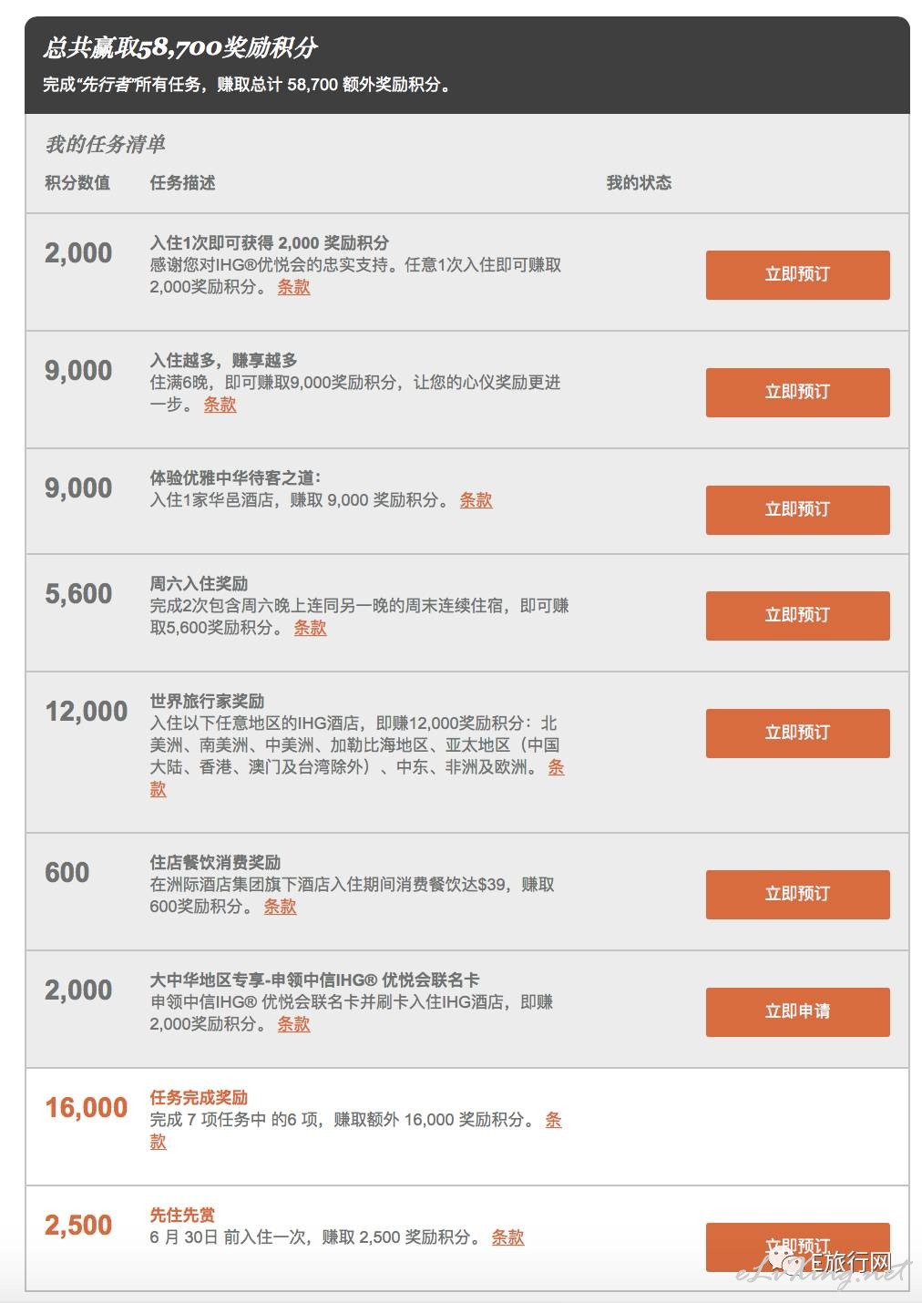 任意入住一次得2000分 入住满6晚得9000分 入住华邑品牌得9000分 两次周六连住得5600分 入住指定地区的IHG得12000分(北美洲、南美洲、中美洲、加勒比海地区、亚太地区(中国大陆、香港、澳门及台湾除外)、中东、非洲及欧洲。) 任意酒店餐饮消费满40美金得400分 申请中信IHG信用卡2000分 完成以上任意6项任务,再得16000分 6月30日前入住得2500分 ---------------------------------------------------- 任务是叠加的话,如果6月底之前预定了泰国任意一家IHG,是不是就可以得到: 任意入住一次得2000分 + 入住指定地区的IHG得12000分 + 6月30日前入住得2500分 = 16500???  |