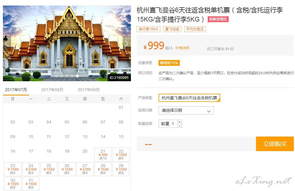 7月21日 杭州直飞曼谷6天往返含税机票 999元 ...