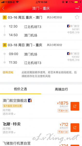 澳门航空重庆澳门700