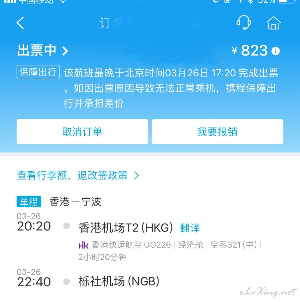 最近要去香港办事, 搜了一下, 发现携程上价格比较便宜(实际上同程价格最低, 但是考虑到携程更大一点, 还是在携程上订了) 在手机APP上预定的, 预定的时候没注意, 等付款完毕发现成了保证在出发前3小时出票(保障出行) ...