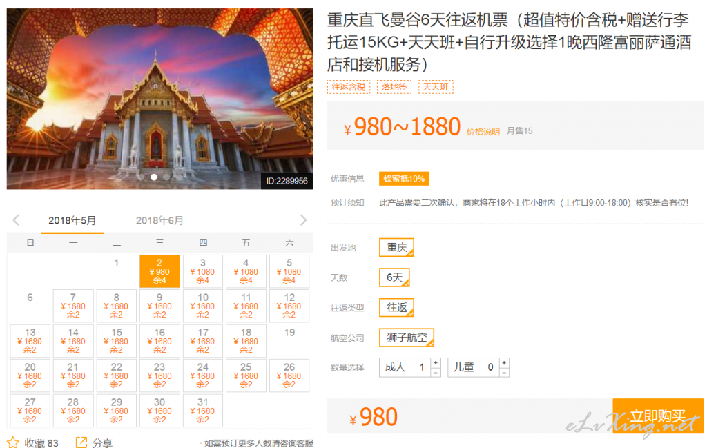 5月2日 重庆直飞曼谷6天往返含税机票 980元 ...