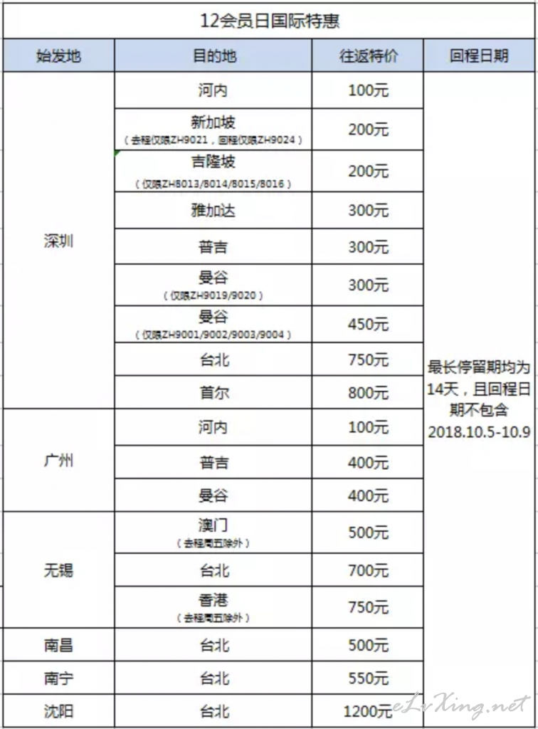 1、购票日期:2018.09.12 2、去程日期:2018.10.05-10.27 3、回程日期:2018.10.10-10.27 4、购票渠道: 深航官网、深航APP、深航微信、客服热线95361、深航官方旗舰店 ...
