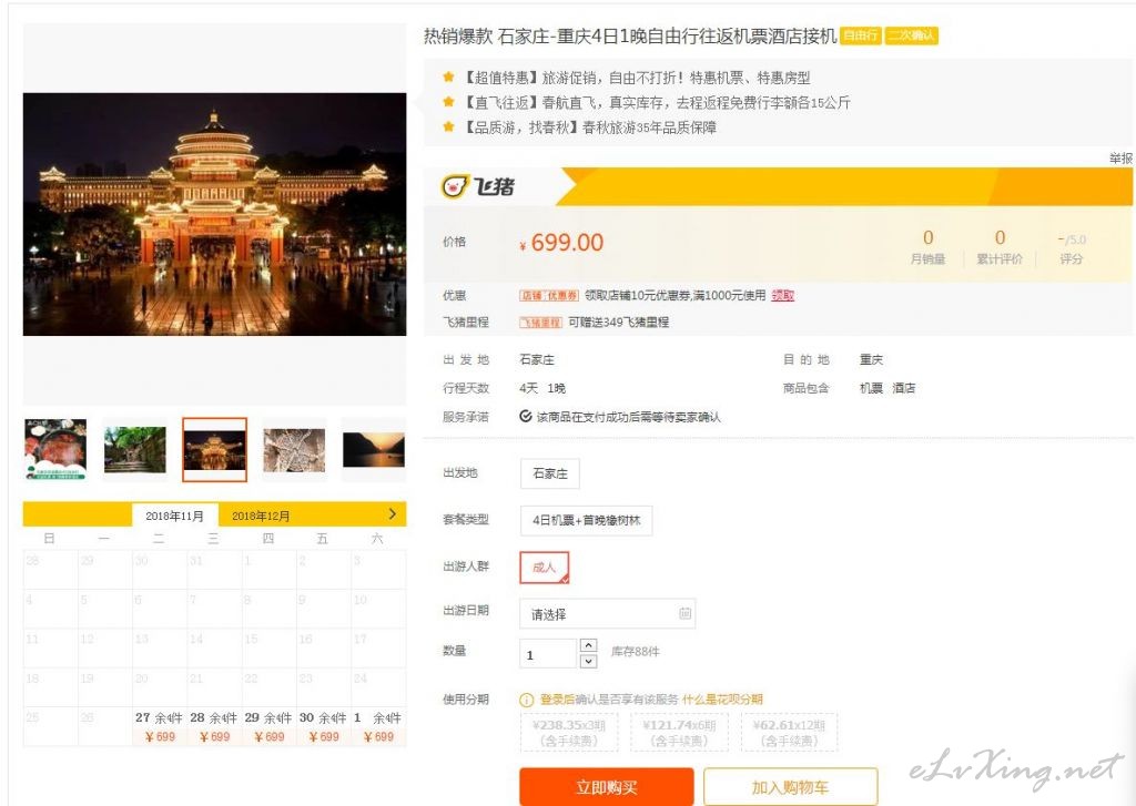 11/12月多日 石家庄-重庆4日往返含税机票+首晚酒店 699元