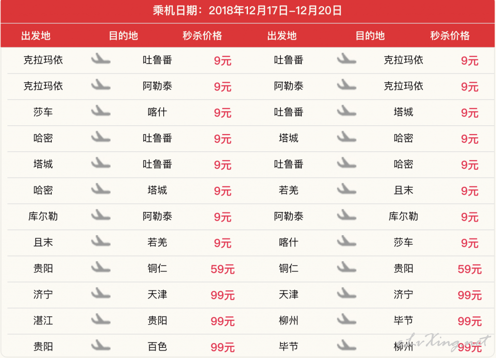 机票秒杀包含:9/59/99/199/299不等,新疆省内9元最多。