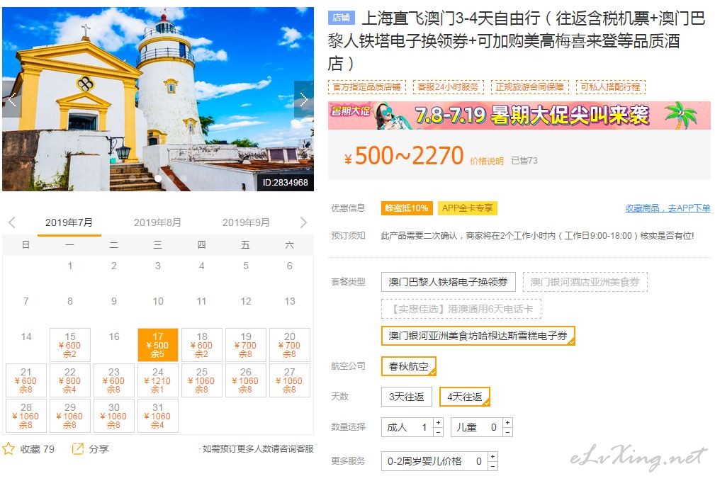 7月17日 上海直飞澳门4天往返含税机票 500元 ...