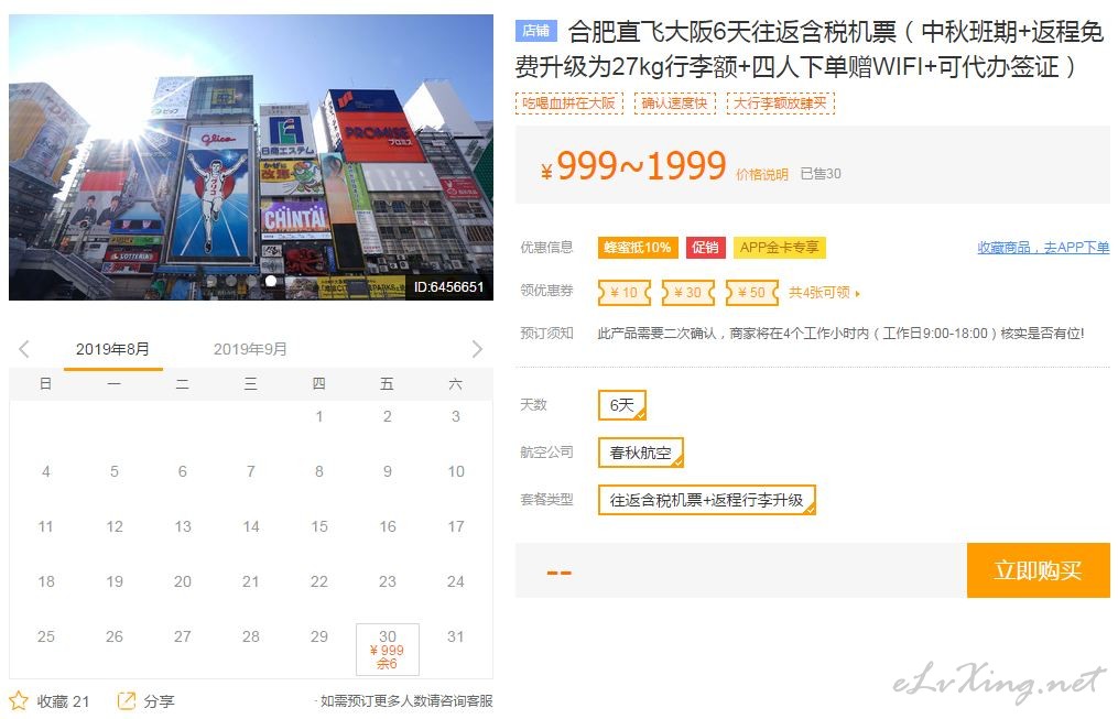 8月30日 合肥直飞大阪6天往返含税机票 999元 ...