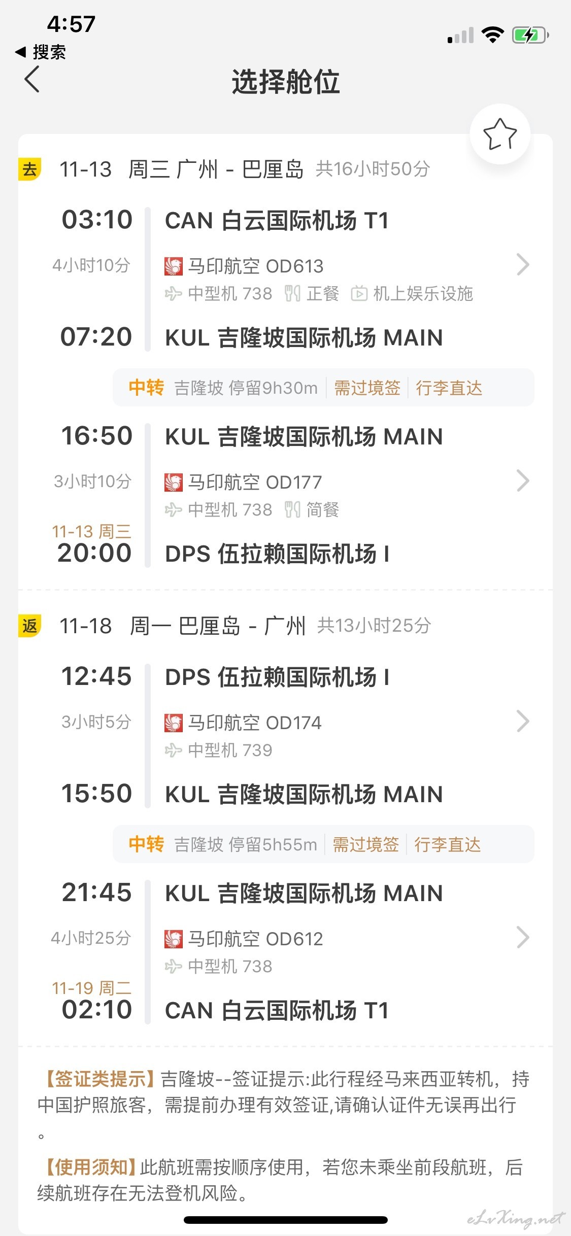 马印航空 广州-巴厘岛 11月 1300元