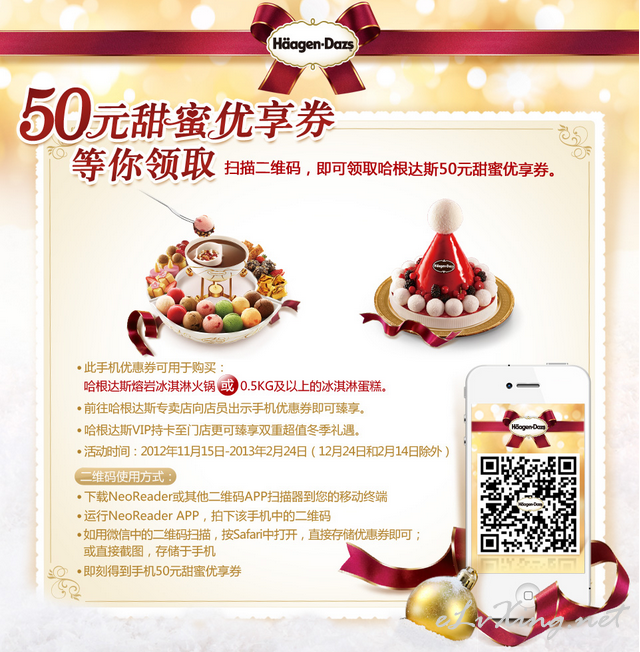 持该券可以在购买哈根达斯熔岩冰淇淋火锅或者0.5kg及以上冰淇淋蛋糕时抵扣。 活动时间是:2012年11月15日-2013年2月24日(12月24日和2月14日除外) http://www.haagendazs.com.cn/codeCoupons.html ...