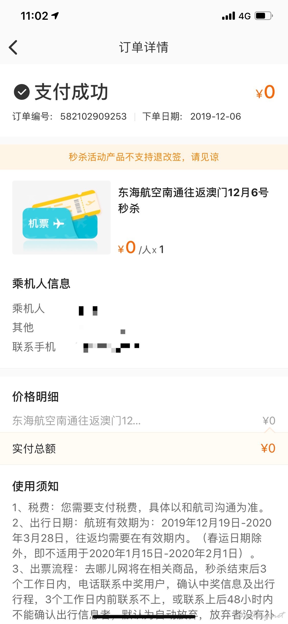 本帖最后由 CC在憧憬 于 2019-12-11 20:48 编辑 去哪儿抢到的南通~澳门往返不含税,有谁需要的,白送!