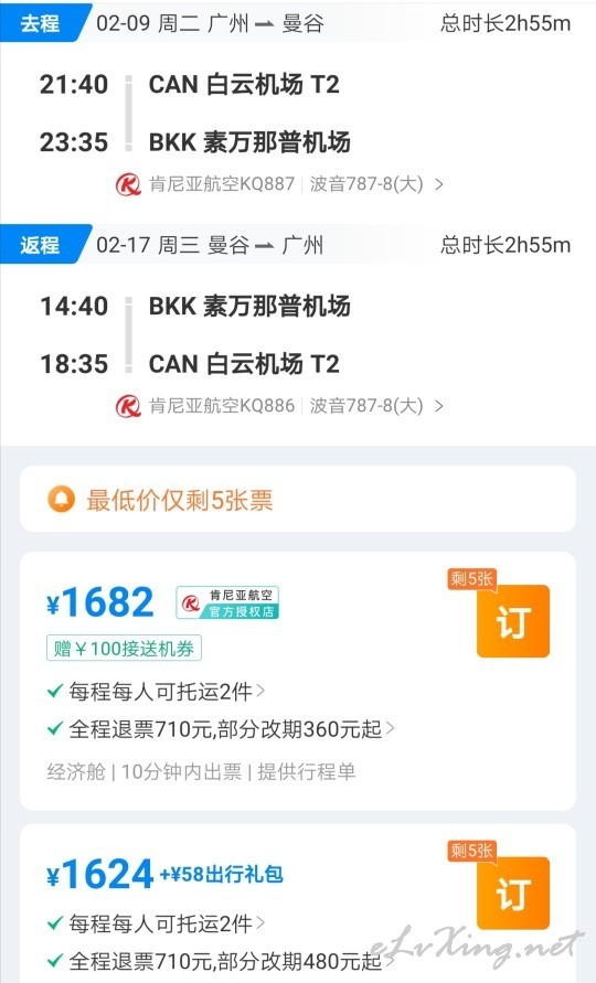 肯尼亚航空 春节广州直飞曼谷含税1624
