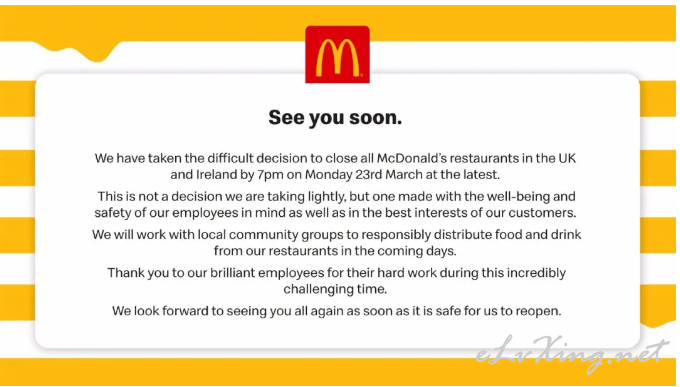 由于新冠肺炎疫情的爆发,麦当劳宣布将从周一(23日)晚间开始暂时关闭其在英国和爱尔兰的所有门店,麦当劳在声明中称,这不是一个轻易的决定,而是为了顾客和员工的安全考虑。该公司表示:“我们已作出这一困难决定 ...