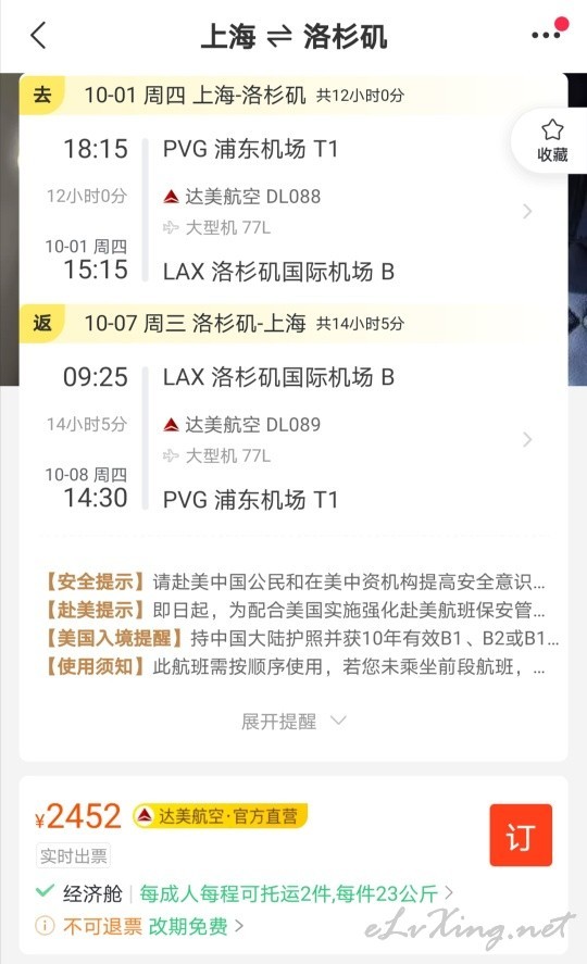 我也来证明确实正国庆有2300多的直飞往返,我不记得是在哪里看到的了,我当时也是看到别人发的,还是在微信公众号,才去搜索正国庆,的确是有1号去6/7/8/9回的上海=洛杉矶的达美直飞往返含税2300多~ |