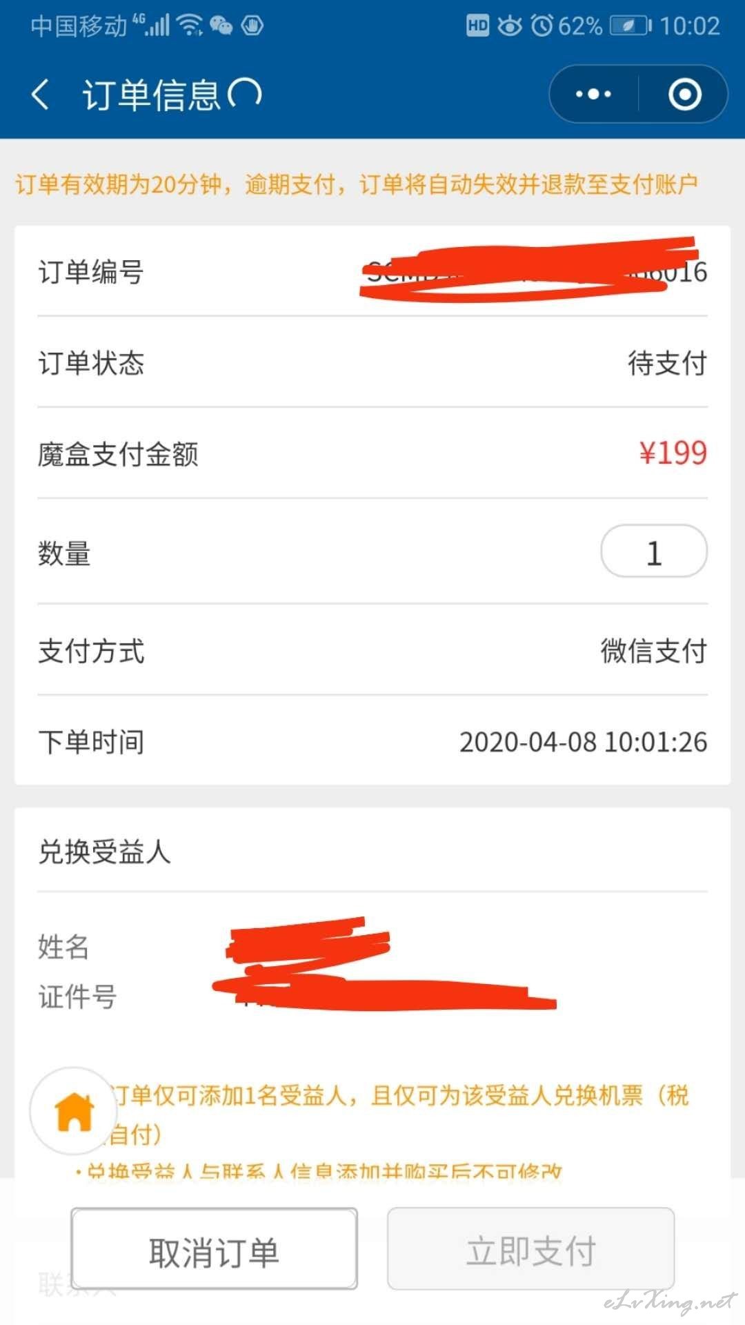 一直担心退出后会取消订单,不敢退出付款页面,谁知道退出付款页面,重新进入1秒付款成功。 四个魔盒,俩人往返,顺利毕业了。 只差抢票去浪。 |