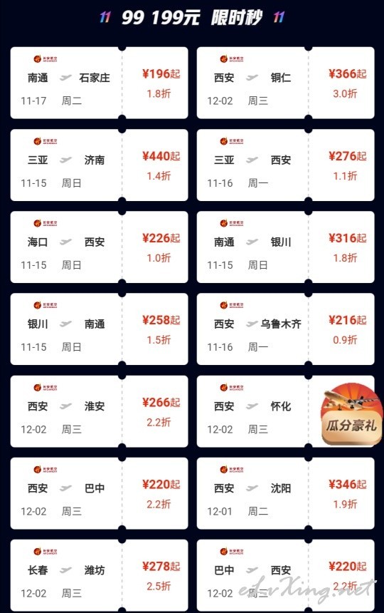 11月8日 11日全天 京东APP-生活旅行-机票-长安航空促销页面