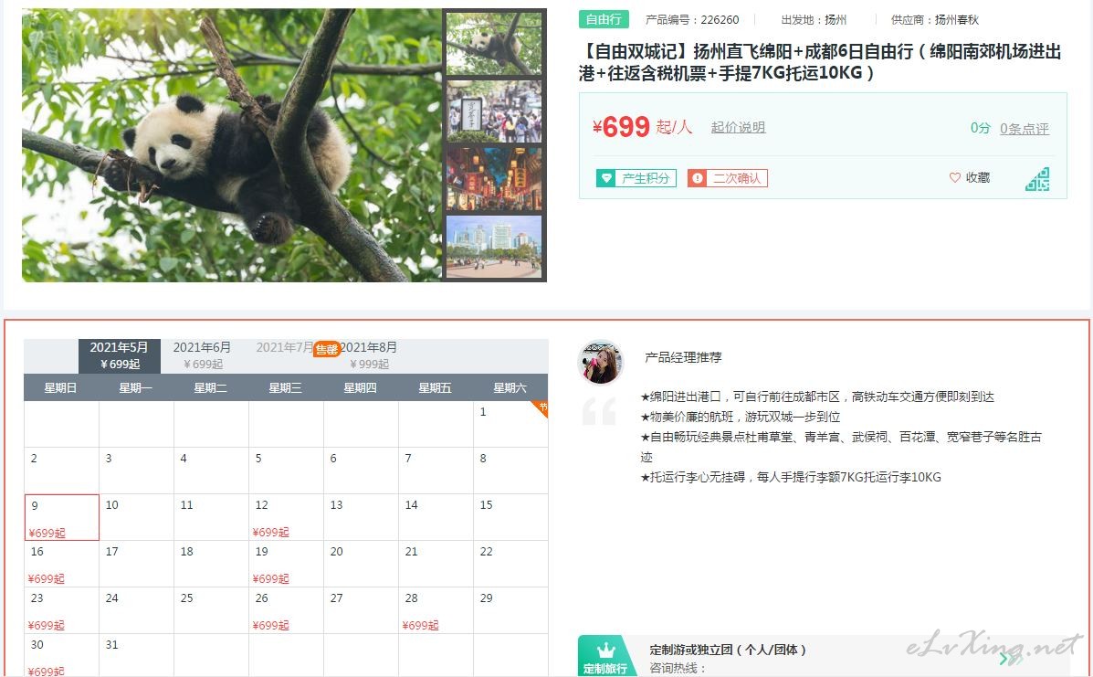 5/6月多日 扬州飞绵阳6日往返含税机票 699元 ...