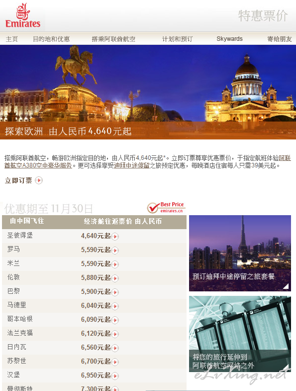 搭乘阿联酋航空,畅游欧洲指定目的地,由人民币4,640元起*。立即订票尊享优惠票价,于指定航班体验阿联酋航空A380空中豪华服务。更可选择享受迪拜中途停留之旅预定优惠,每晚酒店住宿每人只需39美元起。 *以上优 ...