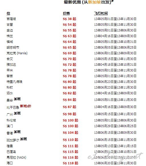 http://www.tigerairways.com/sg/cn/real_deals.php 新加坡-曼谷84 新加坡-广州98 新加坡-科伦坡100 都是含税新加坡元 没有亮点 预定4.10-4.15 大部分航线,出行时段到11月,个别类似金边、胡志明、澳门等仅到6月 ...