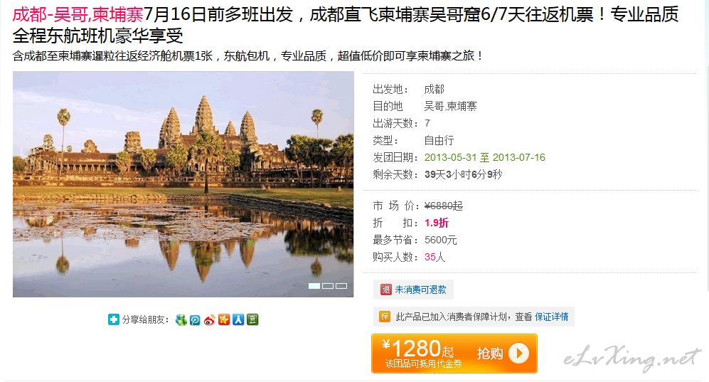 本帖最后由 WoiPeanut 于 2013-5-28 22:02 编辑 中国东方航空 成都=暹粒/吴哥 团购 往返未税1280元起(含税2400元起) 出发日期截止2013年7月16日。 http://tuan.qunar.com/team.php?id=QNRMTgwMDE2MA==&in_trac ...