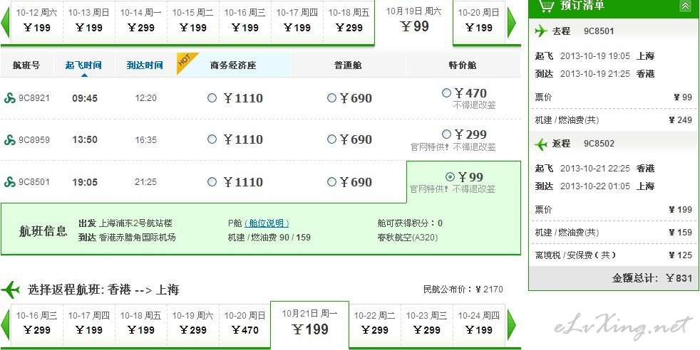 这个99元机票,回程有点贵 10月还有飞香港99元机票