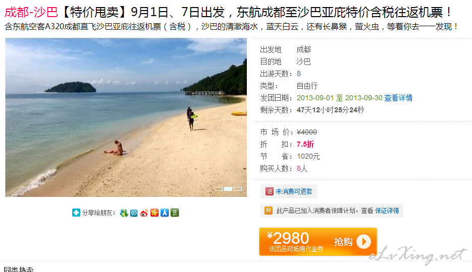 成都-沙巴【特价甩卖】9月1日、7日出发,东航成都至沙巴亚庇特价含税往返机票! 含东航空客A320成都直飞沙巴亚庇往返机票(含税),沙巴的清澈海水,蓝天白云,还有长鼻猴,萤火虫,等着你去一一发现! 目前成都转 ...