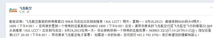 原文: Flight Advisory: To all passengers of Zest Air flight Z2 948 departing from Manila to Kuala Lumpur (KUL-LCCT) tomorrow, Monday, August 19,2013, please proceed to NAIA Terminal 4 tomorrow, ...