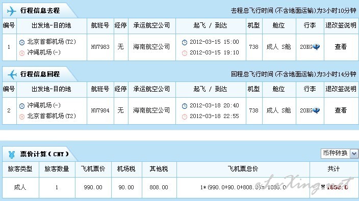 海南航空推出北京往返冲绳的机票特惠,每人仅需 ¥990起,即可3.5小时直达冲绳,感受花样琉球。旅行日期:2012年2月1日—2012年3月31日(大部分时间)此次海航推出的特价极具吸引力,机票价格 ¥990,税费为 ¥898, ...