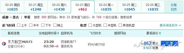 东航2月23日成都单程普吉岛462元,含税1027,价格可与廉价航空相比,且无需中转 直达链接:http://flight.qunar.com/
