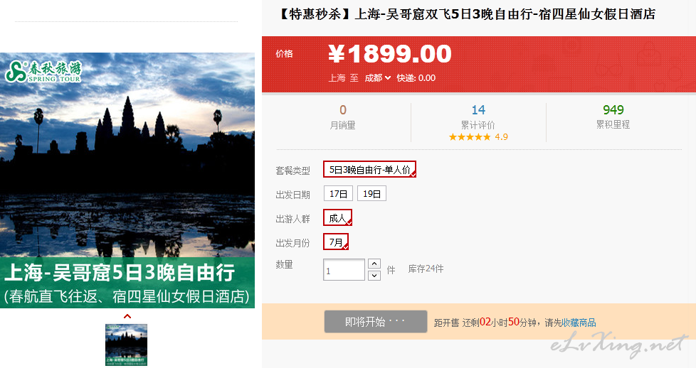 本帖最后由 E旅行新闻官 于 2014-7-2 12:13 编辑 【预订链接】http://detail.tmall.com/item.htm?&id=36715235968 【抢购日期】7月2日15:00 【出行日期】7月17日、19日 【费用包含】 1、交通:上海-暹粒-上海 ...