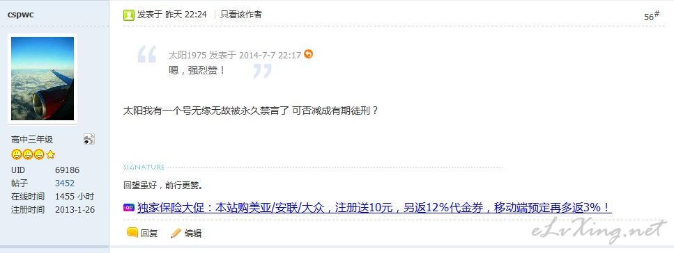 本帖最后由 cspwc 于 2014-7-8 10:47 编辑 话不多说,刚来E旅行时注册了个号,无缘无故被永久禁言无法访问等操作,无任何提示,无任何警告。难道说就因为换了个偶像的头像?那你也给人个改过自信的机会呢。 私信 ...