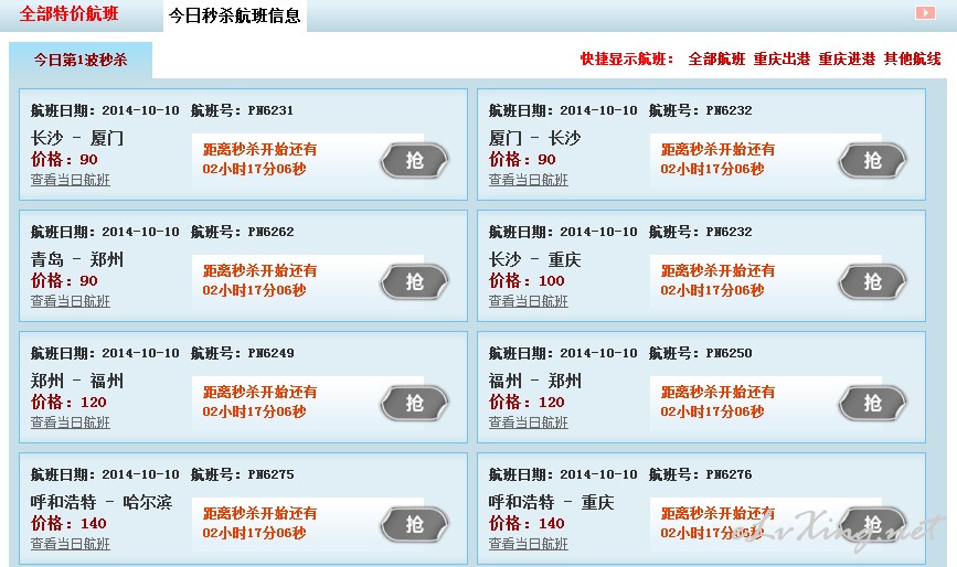 http://www.chinawestair.com/frontend/miaosha/display.action 本期的秒杀还是跟以前差不多 7月9日11:30~14:00抢 出行 库尔勒航线7月19日~26日 其他航线9月26日~10月10日 长沙-厦门90/重庆100 郑州-福州120/哈 ...